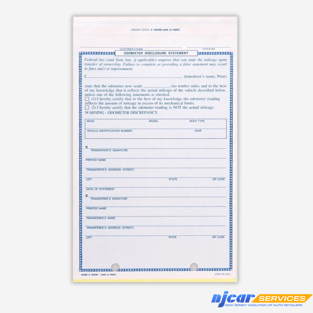 3-Part Odometer Statement. Complies with all Federal Mileage Disclosure Laws.